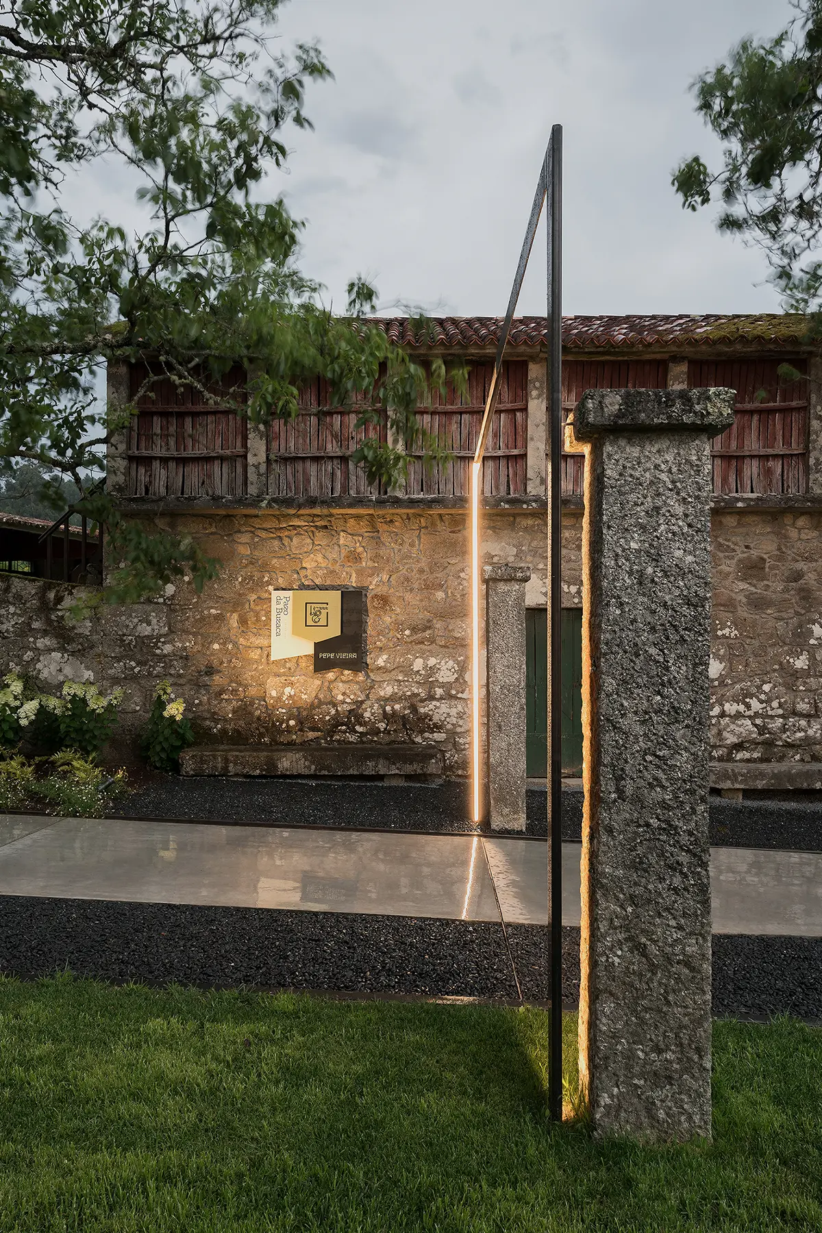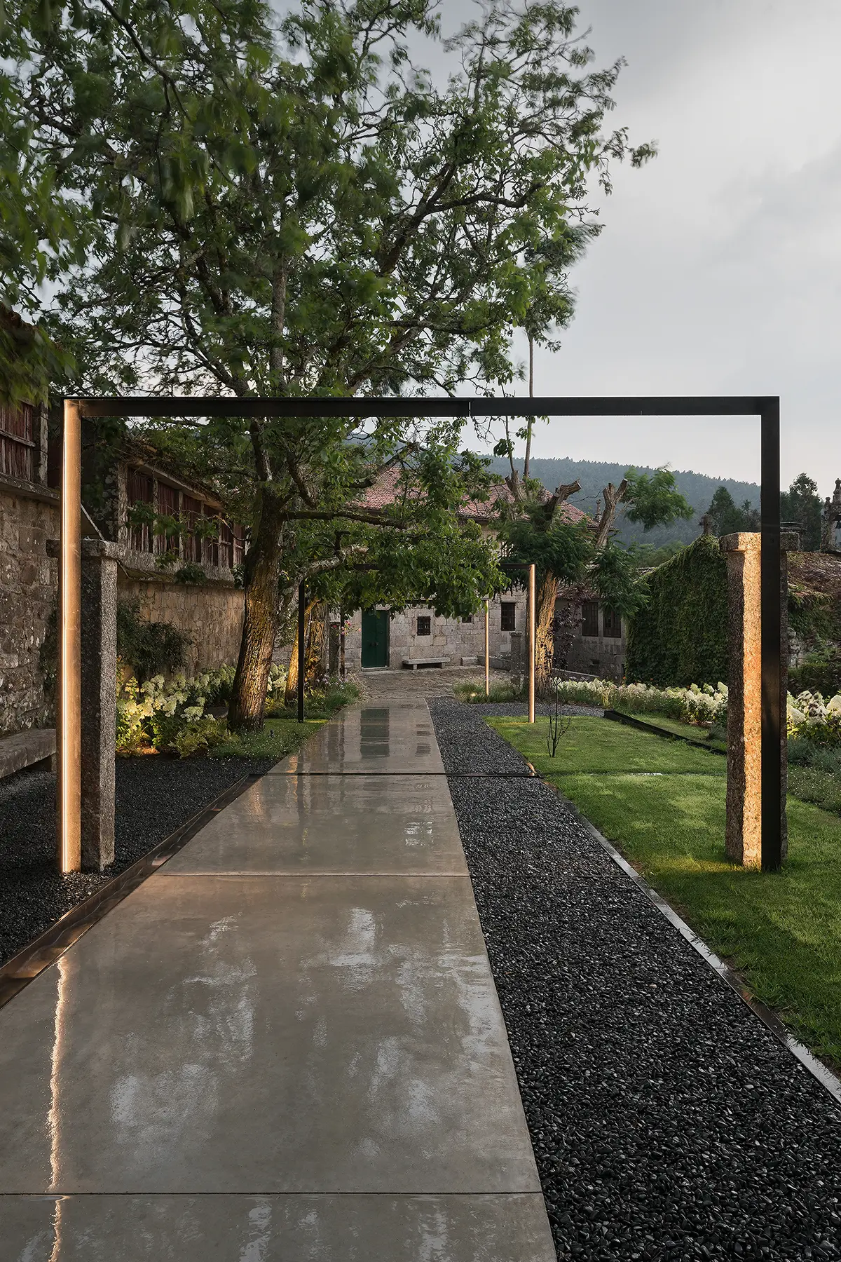 En ese recorrido nos acompañan también una estructuras ligeras a modo de pórticos, vinculados a unos pilares de piedra preexistentes, que además de incorporar el ritmo en el trayecto, integran la iluminación y ofrecen una escena distinta cuando el sol se pone.