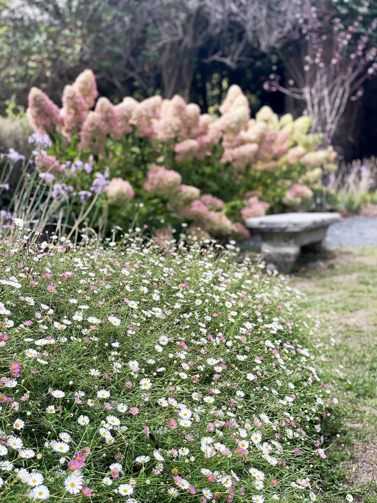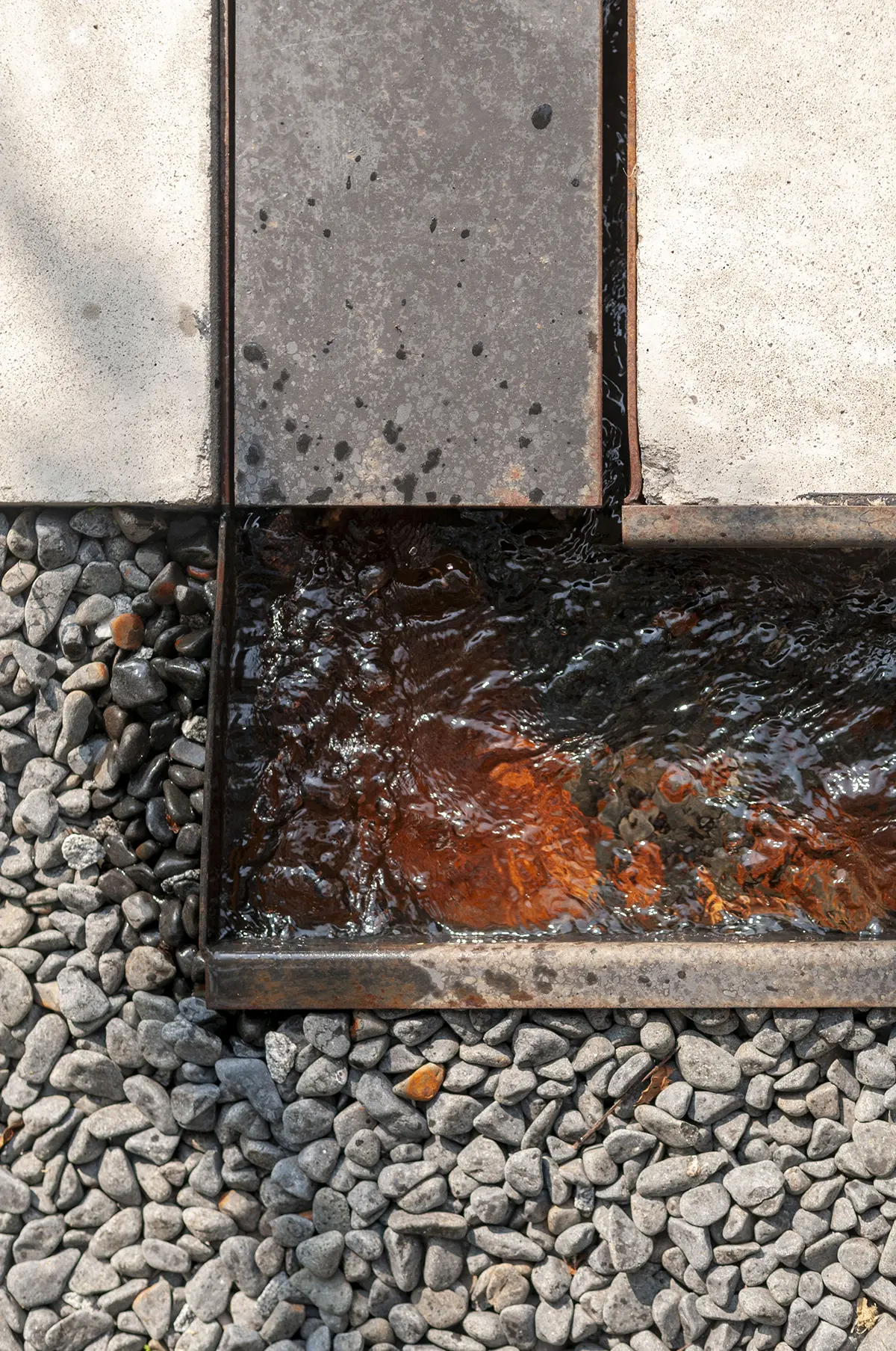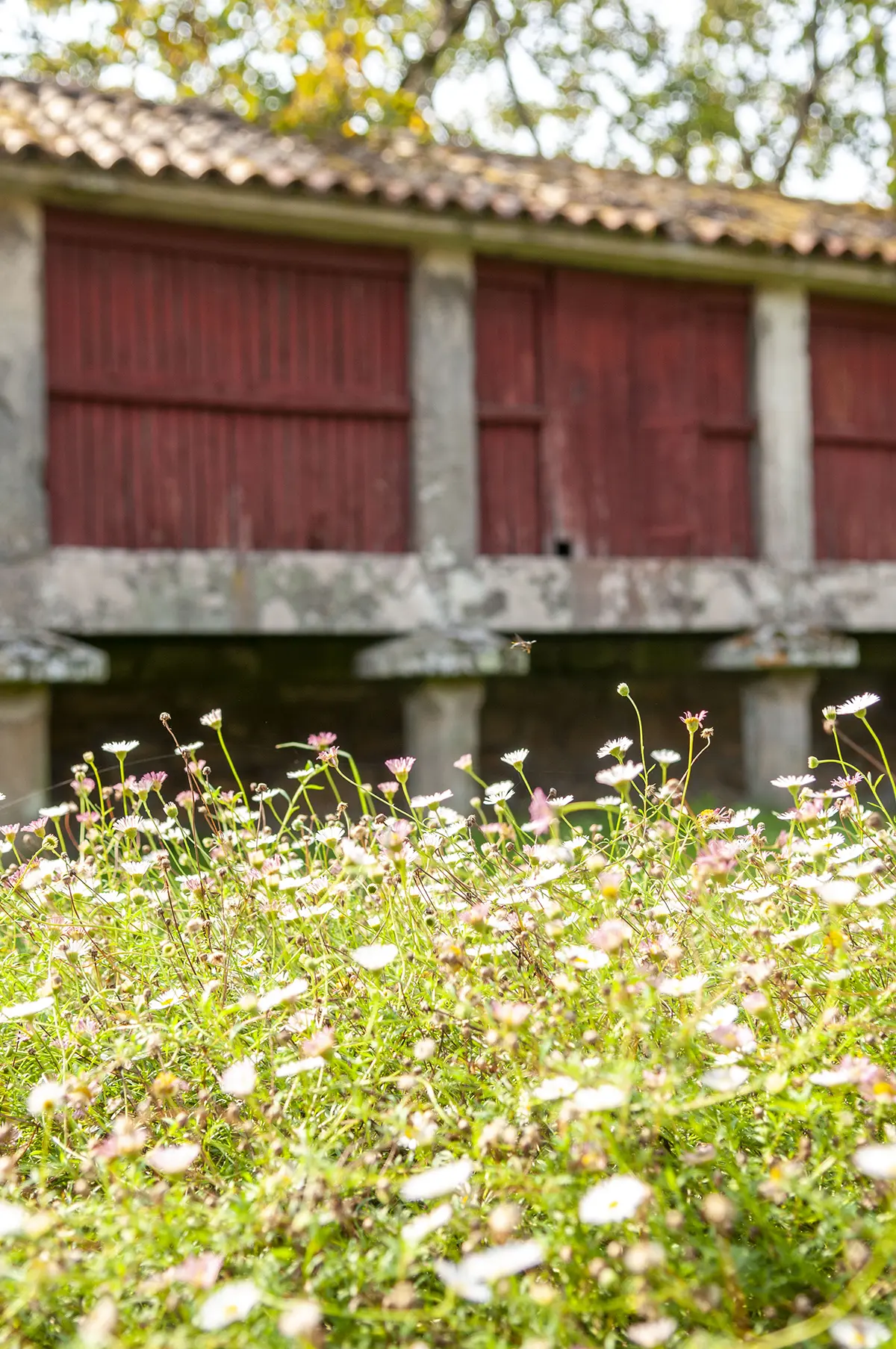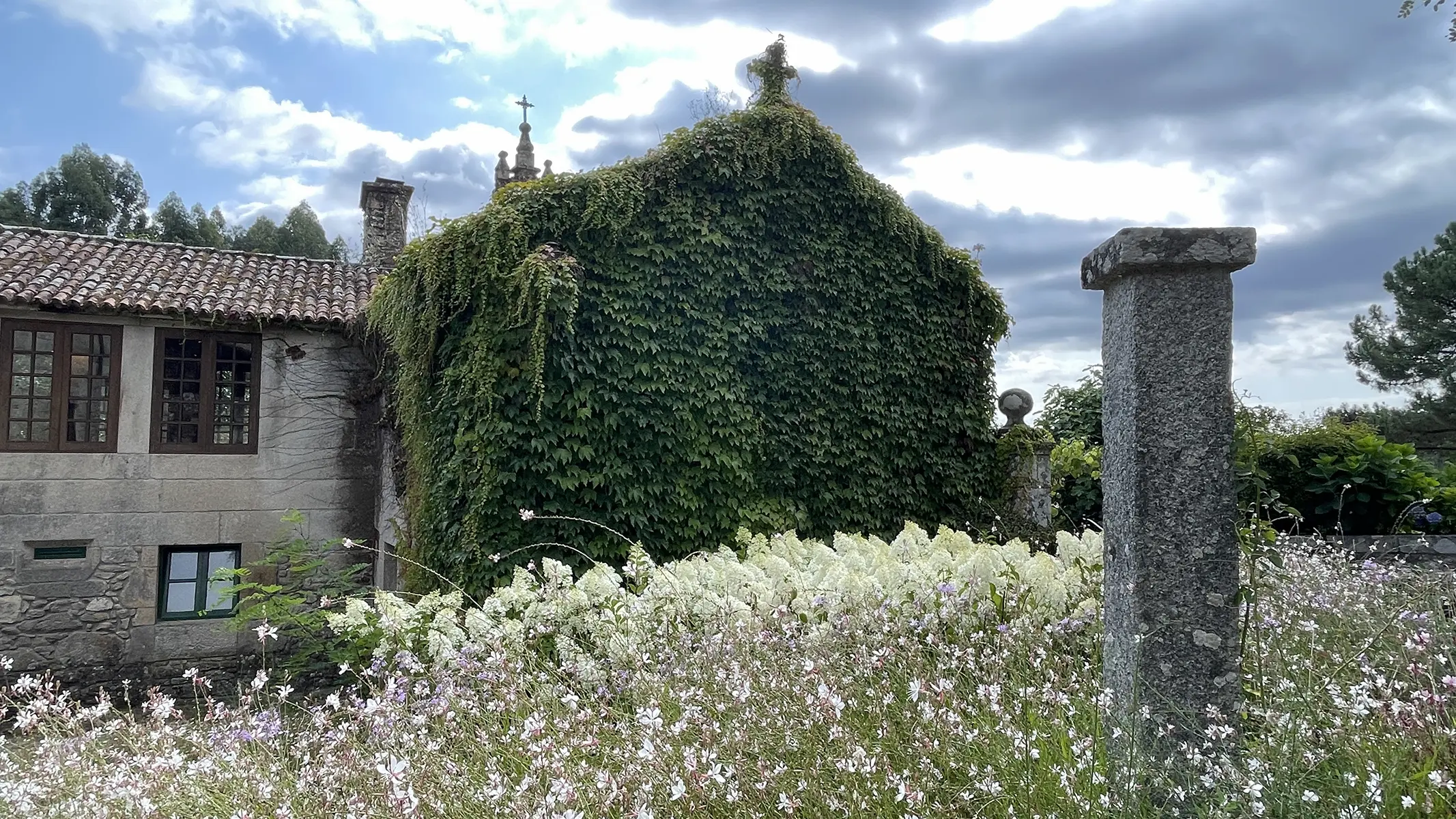 Es la parte del jardín que recibe al visitante y lo conduce hacia el edificio del pazo o hacia el renovado salón de celebraciones. Buscamos potenciar la presencia del agua, naturalmente existente en la finca, mediante la construcción de un canal que discurre en paralelo al camino. Su movimiento y sonoridad son antesala del regato que nos encontraremos en la parte baja de la parcela.